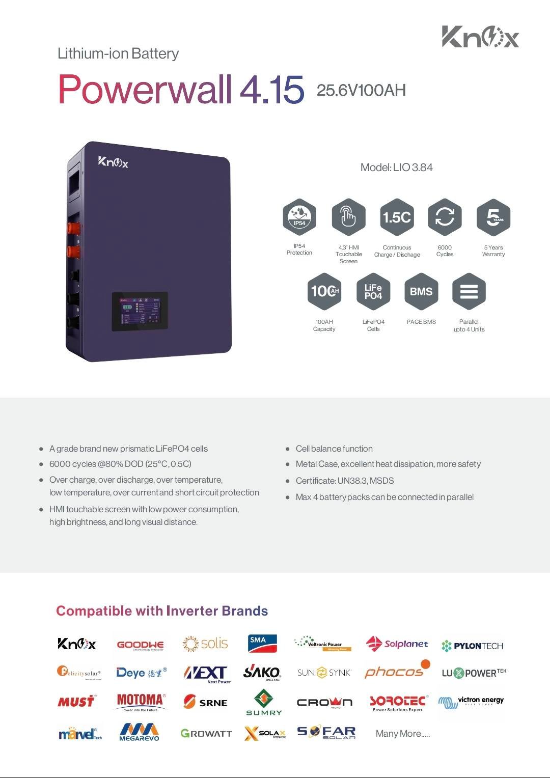 The Knox Powerwall 4.15 (Model LIO 3.84) is a high-performance 25.6V 100Ah LiFePO4 lithium battery designed for solar energy storage, backup power, and off-grid systems.