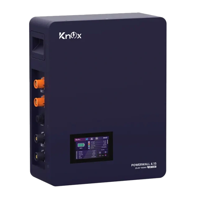 Knox Powerwall 4.15 Lithium Battery (LIO 3.84) 25.6V 100Ah LiFePO4 lithium battery with 6000+ cycles, smart BMS, touchscreen display, and IP54 protection. Ideal for solar & backup power.