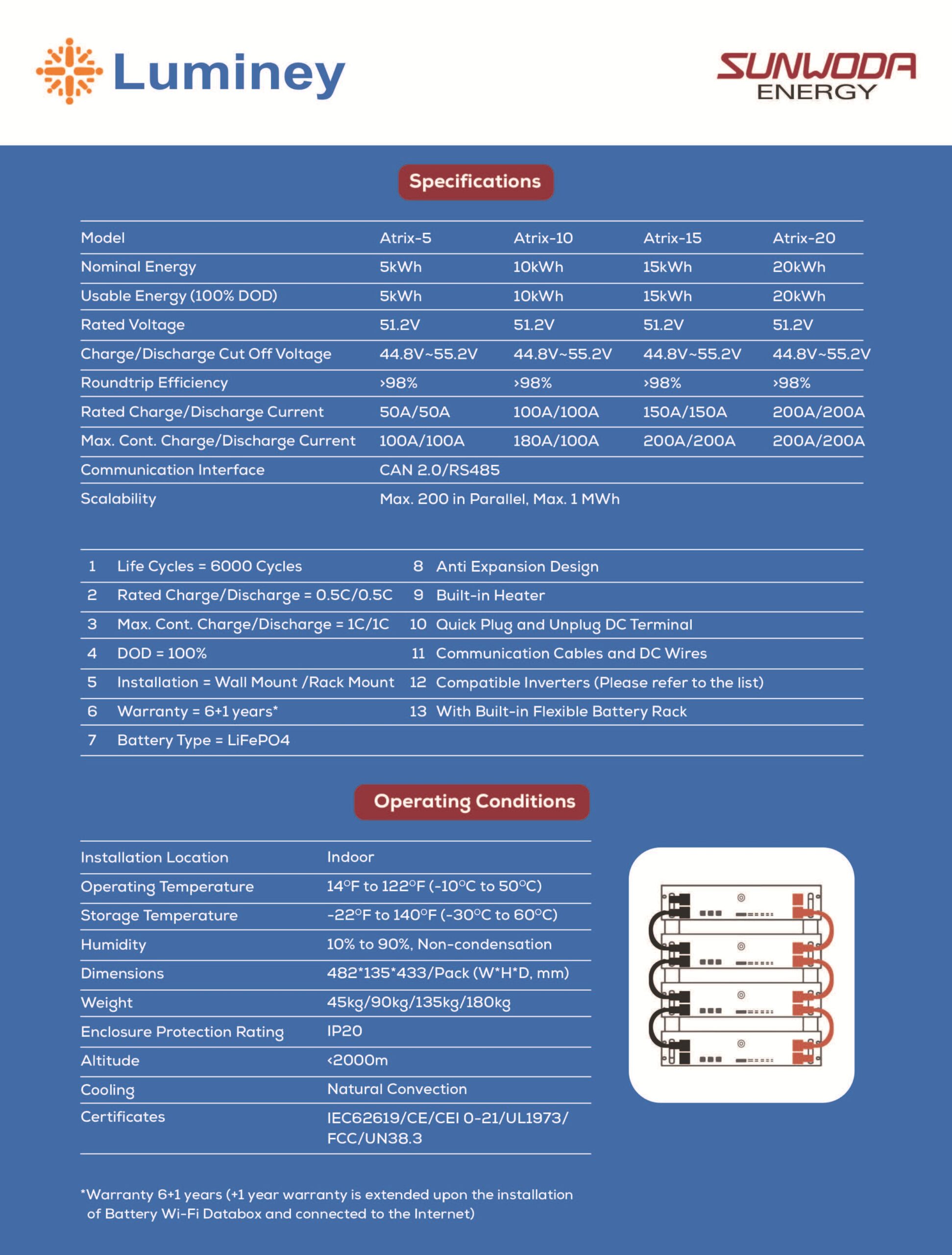 Buy Sunwoda Luminey Atrix 51.2V Lithium Battery 100Ah LiFePO4 lithium battery with 6000 cycles, 98% efficiency, CAN/RS485 communication & wide hybrid inverter compatibility. Ideal for residential & commercial solar energy storage. 6+1 years warranty.